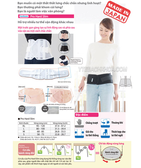 - Tập đoàn Daiya Industry – Nhật Bản là một trong những đơn vị tiên phong trong việc nghiên cứu và phát triển sản phẩm đai cố định lưng phục vụ phương pháp bảo tồn, trong đó có thể kể đến chiếc đai lưng Pro Hard Slim Nhật Bảnthương hiệu BonBone là một trong những sản phẩm hỗ trợ đắc lực cho cột sống, áp dụng phương pháp bảo tồn dành cho trường hợp: