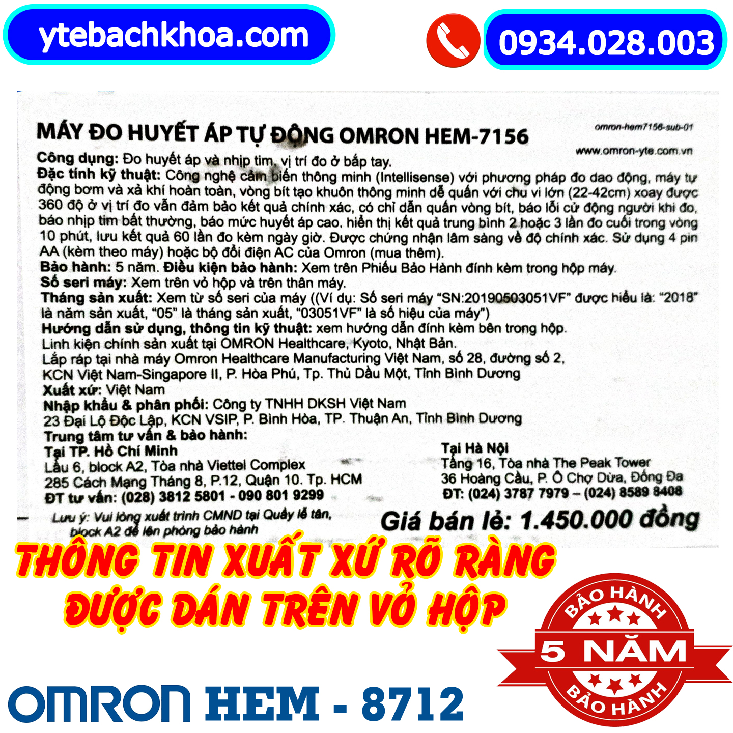 - Xuất xứ: LINH KIỆN CHÍNH SẢN XUẤT TẠI OMRON HEALTHCARE, KYOTO, NHẬT BẢN, LẮP RÁP TẠI NHÀ MÁY OMRON BÌNH DƯƠNG, VIỆT NAM