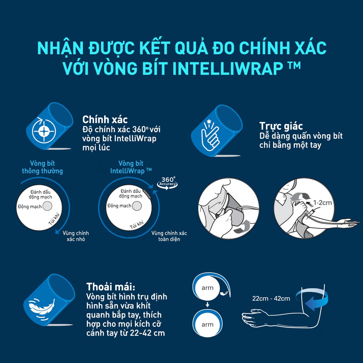 IntelliSense & thương mại; Máy bơm hơi vòng bít đến mức lý tưởng với mỗi lần sử dụng. Người dùng không cần điều chỉnh để chọn mức bơm hơi. Điều này đặc biệt thuận tiện cho người sử dụng bị tăng huyết áp và cho những người bị rối loạn nhịp tim hoặc rối loạn tim, vì huyết áp của họ có khả năng lên xuống thất thường.