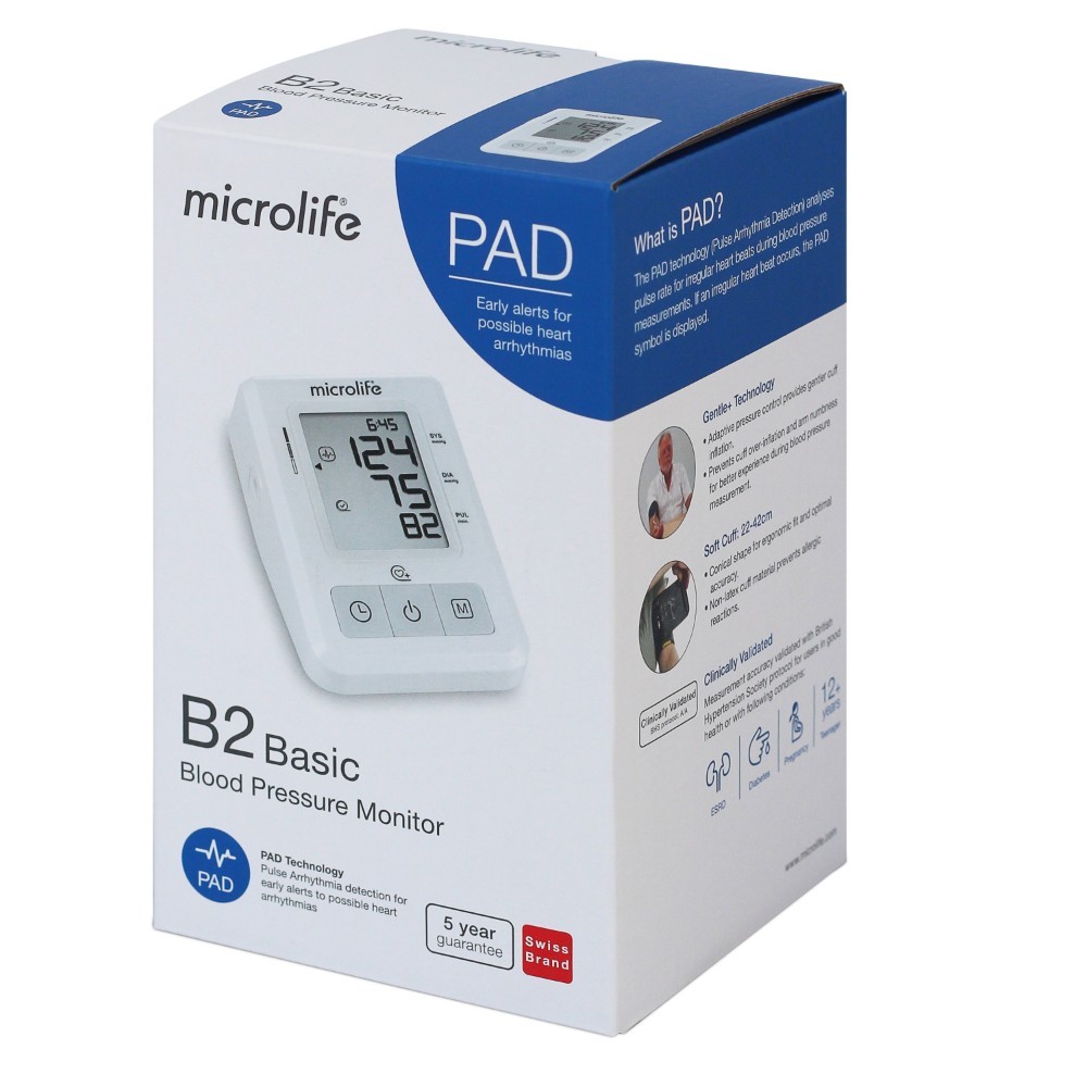 Máy đo huyết áp Microlife BP B2 Basic thế hệ mới cho độ chính xác cao, dễ sử dụng, là model lý tưởng cho người mới bắt đầu đo huyết áp tại nhà. Máy dùng để đo huyết áp, nhịp tim, cảnh báo nguy cơ loạn nhịp nhờ công nghệ PAD, đo êm ái nhờ công nghệ Gentle+.